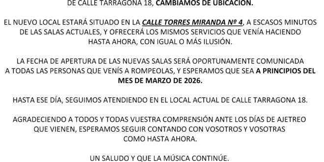Locales de Ensayo En Rompeolas seguimos teniendo para esta temporada 2026, 3 locales de ensayo por horas, insonorización box in box, acondicionados acústicamente, cómodos, amplios, con buen equipo. La mejor relación calidad-precio, intentando ofreceros el mejor espacio, locales en un ambiente musical, actividades, zona de estar y cafetería para clientes. Y con la mejores ofertas: 10 €/hora por …
