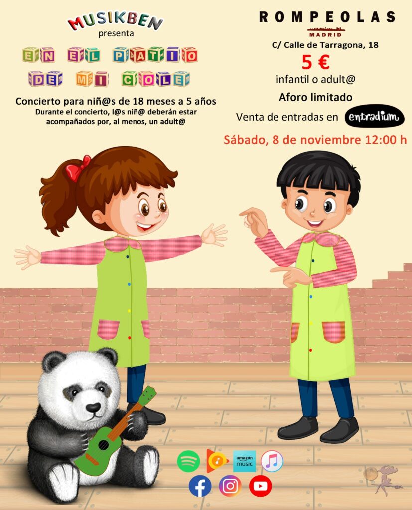 Con 8 años de bagaje y dos discos a sus espaldas Musikben sigue volcado en ofrece un espectáculo para disfrutar en familia. Benjamín Moreno y Raquel Almagro son los creadores de este proyecto que ofrece composiciones de calidad expresamente creadas para que los más pequeños de la casa disfruten y tengan acceso a un universo musical repleto de originalidad y diversión. Sus directos se estructuran alrededor de diferentes actividades y juegos musicales donde se explora e investiga, se desarrollan habilidades motoras y cognitivas, se adquiere capacidad de atención y escucha, se desarrolla y fomenta la relación y la comunicación social y familiar, se despierta la imaginación, la curiosidad y la creatividad de los más pequeños. ¡¡Todo a través de juego musical!!.