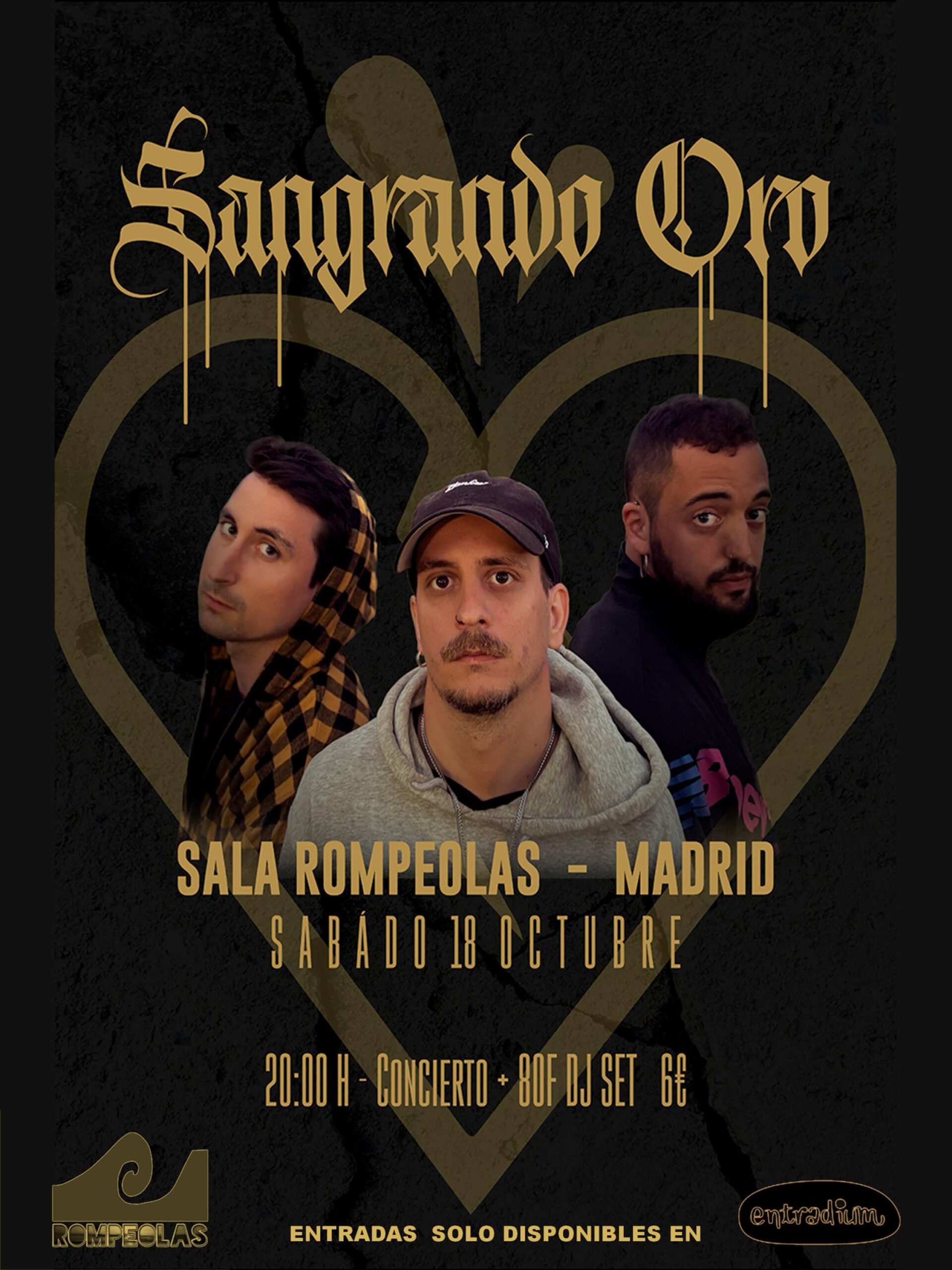 Rompeolas Locales CALLE TARRAGONA, 18., MADRID, Madrid, EspañaNuestros amigos que ensayan en las salas de Rompeolas: A.N.D. Yugen y Manu Dos Madres, bajo la producción de 80F, nos ofrecen sus temas y rimas en este Sangrando Oro, en concierto y sesión DJ, que no te puedes perder. Os esperamos el próximo 18 de octubre en Rompeolas. Os dejamos unos adelantos de sus …