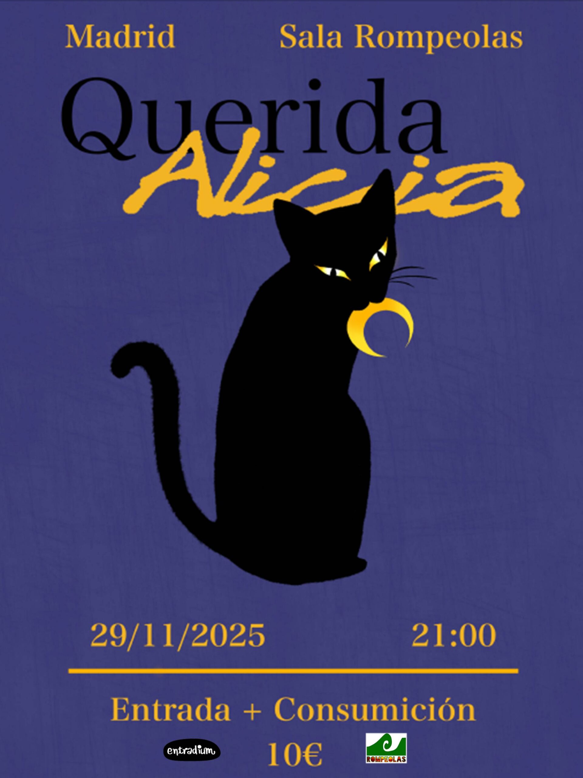 DESCRIPCIÓN DEL EVENTO Concierto de Querida Alicia tras un pequeño parón con nuevos integrantes y nuevas canciones que formarán parte de su próximo EP. Os esperamos. Entradas sólo venta anticipada online en www.entradium.com Precio: 10 €. (incluye consumición:lata refresco, cerveza). Acceso permitido a menores de 16 años acompañados de persona adulta responsable, debidamente identificados. Próximo 29 …